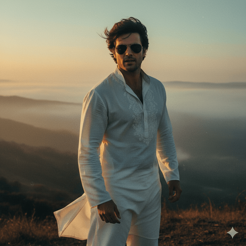 Transform this photo into a 1970s Bollywood hero standing dramatically on a misty hilltop at dusk, wearing a flowing white kurta with aviator sunglasses, wind-swept hair, and a confident smirk. Add golden-hour lighting, film grain, and a desaturated color palette for that classic Amitabh Bachchan vibe—hyper-realistic, 8K, cinematic composition. Dont change facial features.