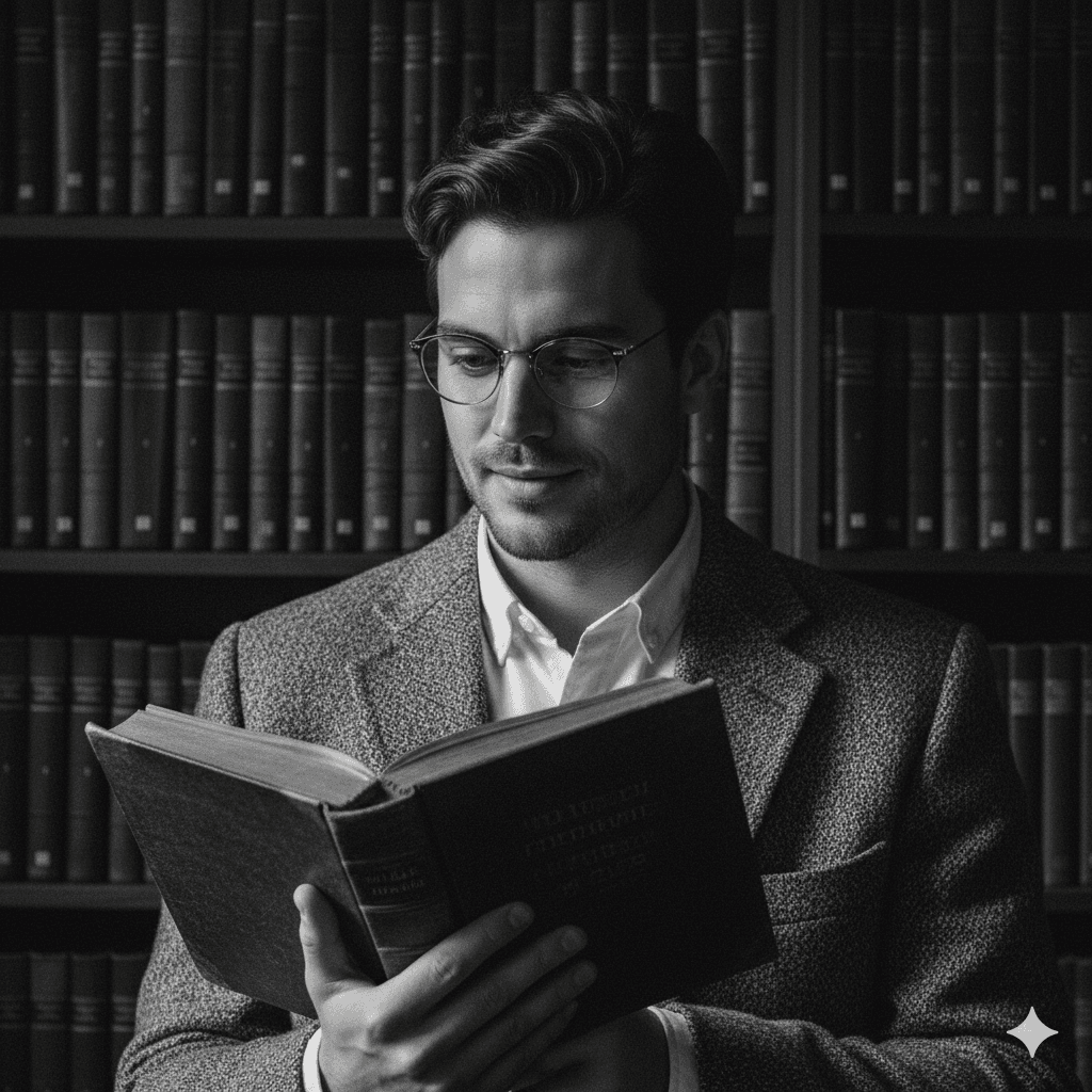 Transform this into a black-and-white portrait of a thoughtful professor in a dimly lit library: tweed jacket, glasses, holding an old book, with soft side lighting and deep shadows on leather-bound shelves. Grainy texture, introspective mood—timeless, photorealistic, like a classic film still. Dont change facial features.