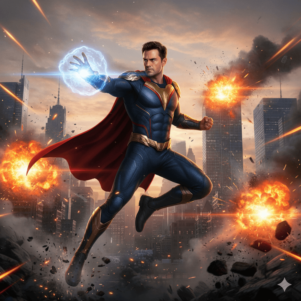 The image shows the user as a Hollywood superhero, posed dynamically mid-action with cinematic lighting and lens flares, exuding powerful energy, set against a dramatic cityscape with explosions, hyper-detailed, 8K. Don't change facial features.