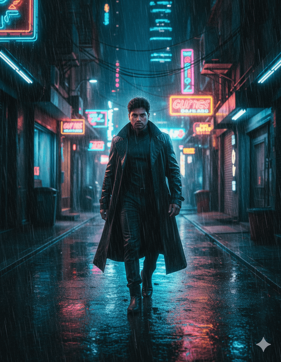 The image depicts the user as a mysterious figure in a dark trench coat, walking under glowing neon signs in a rainy futuristic alley, with cinematic lighting, anamorphic lens, bokeh effect, film grain, 35mm, Hollywood thriller style, dramatic shadows and rain reflections, ultra-realistic. Don't change facial features.