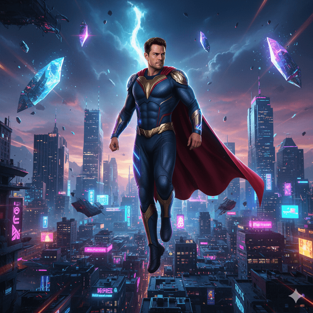 The image portrays the user as a futuristic superhero in a surreal Hollywood style, floating above a dystopian city with a cape billowing in the wind, vibrant neon contrasts with dreamlike elements like floating objects, dramatic volumetric lighting, cinematic composition, 8K. Don't change facial features.