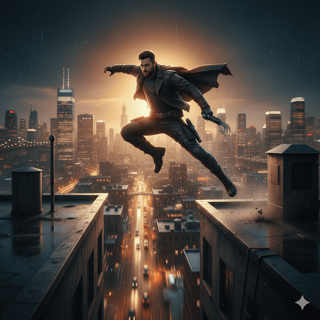 Rooftop Action Hero Leap Prompt