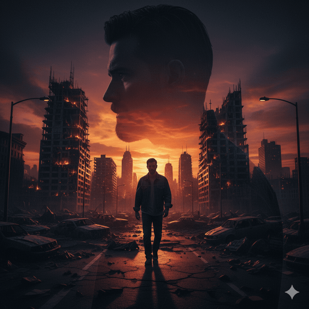 The image portrays the user in a cinematic Hollywood double exposure, with their profile silhouette containing a post-apocalyptic cityscape, walking through a destroyed urban street with ruins and glowing embers, dramatic sunset background, noir grading, 35mm. Don't change facial features.