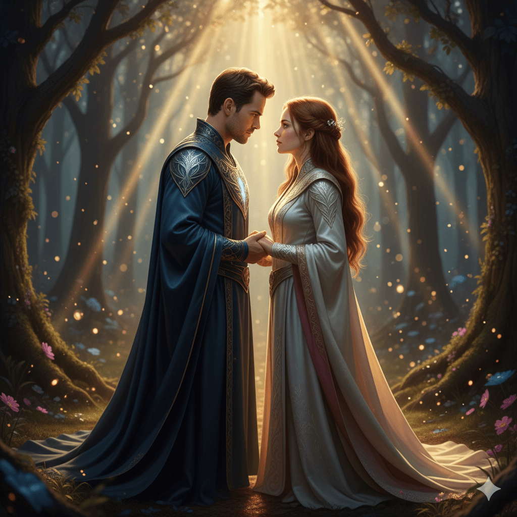 The image shows the user in a Hollywood fantasy romance, as one of the lovers in an enchanted forest at twilight, wearing intricate flowing robes, with volumetric god rays piercing the canopy, emotional gaze, cinematic depth of field, 8K. Don't change facial features.