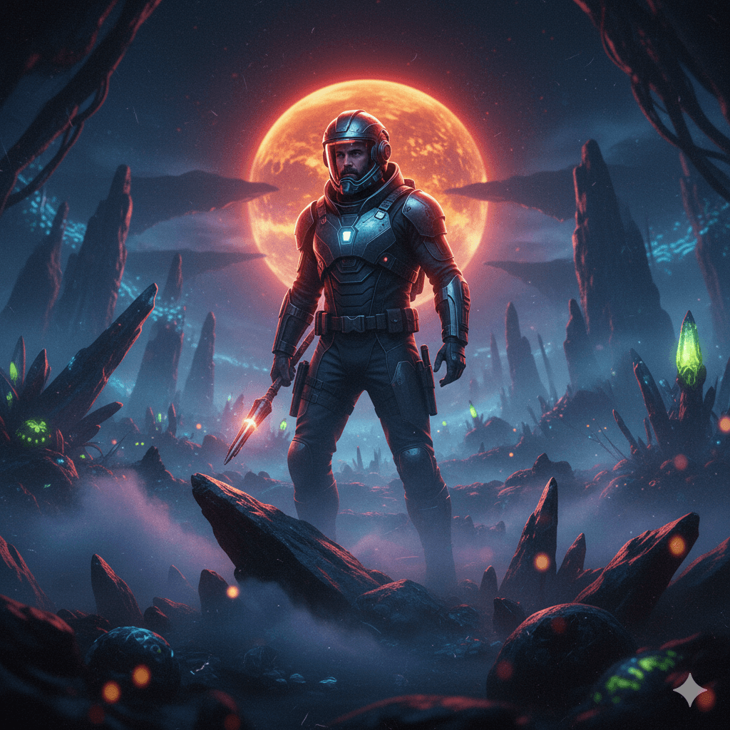 The image depicts the user in a Hollywood sci-fi scene, as a lone explorer in an alien landscape, with volumetric fog, dramatic rim lighting, anamorphic bokeh, film grain, cinematic thriller style, 8K. Don't change facial features.