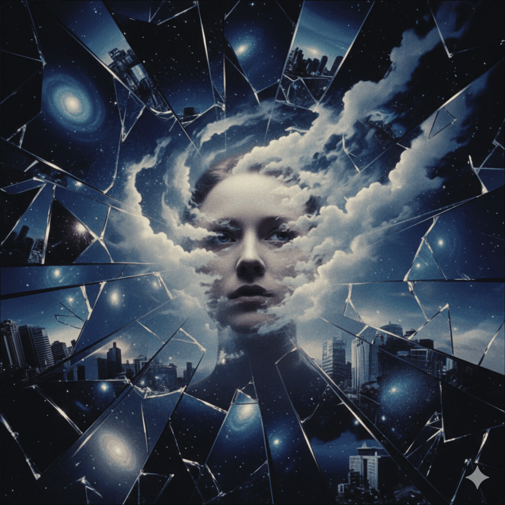 The image shows the user in a surreal Hollywood film still, with their face dissolving into cloud-like pixels against a shattered glass background, evoking a poetic mood with impossible perspectives, high-contrast cinematic lighting, 35mm. Don't change facial features.