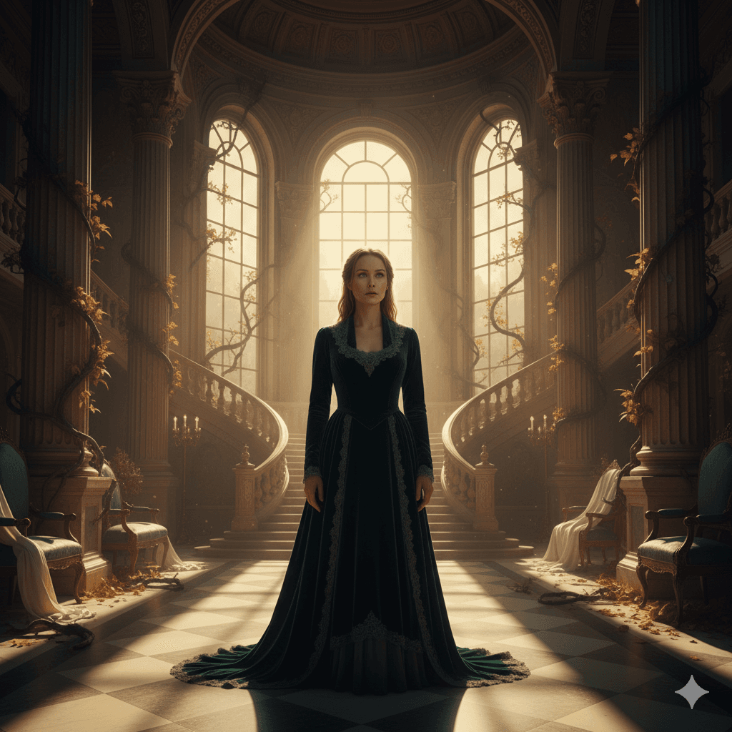 The image portrays the user in a surreal Hollywood scene, as an elegant figure in a vintage mansion hall, with shadows twisting into dreamlike vines, golden hour light through arched windows, dramatic chiaroscuro, 8K. Don't change facial features.