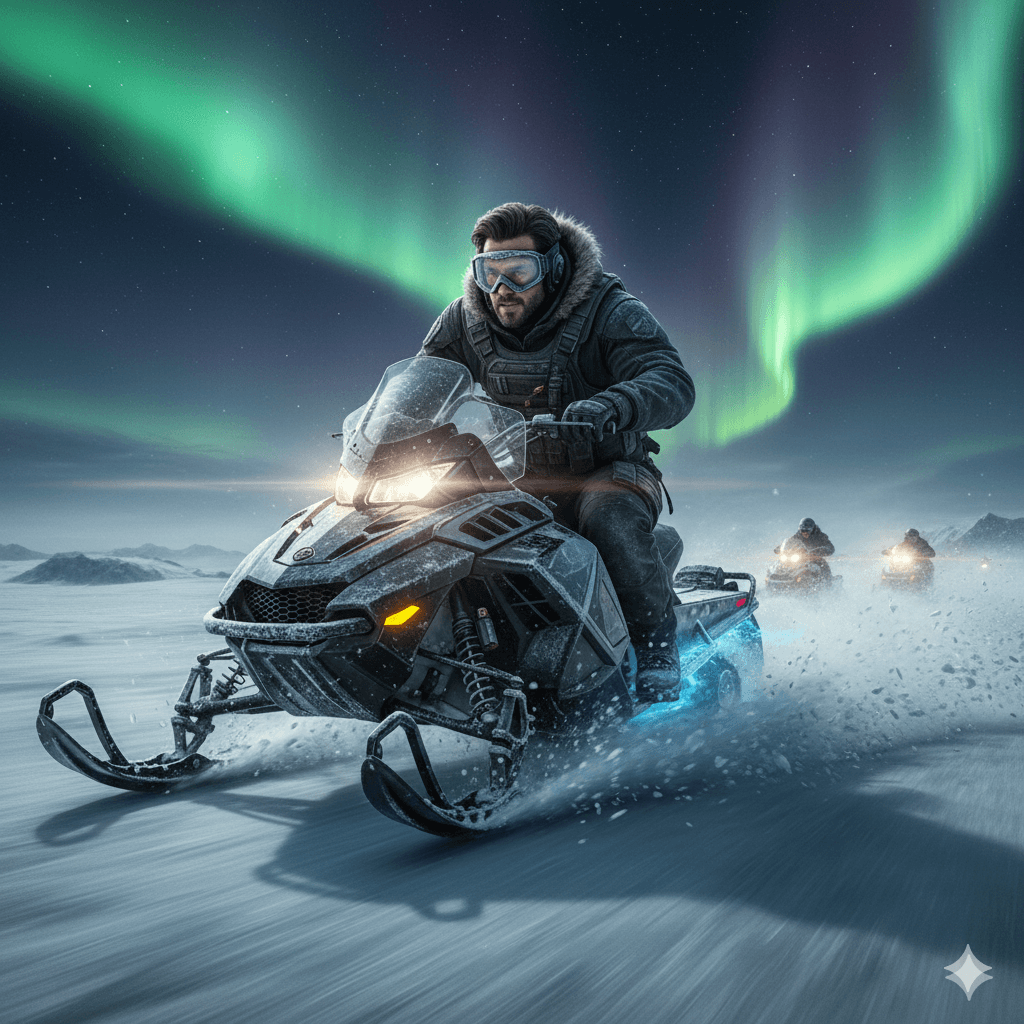 Transform this image into a cinematic scene depicting the person as a daring spy racing a snowmobile across a frozen Arctic tundra, pursued by enemies, with snow spraying around, aurora borealis casting ethereal greens and purples overhead, golden ratio composition, sharp frost effects, cinematic lens flare, 4K resolution. Ensure the person's exact facial features are accurately integrated into the scene.