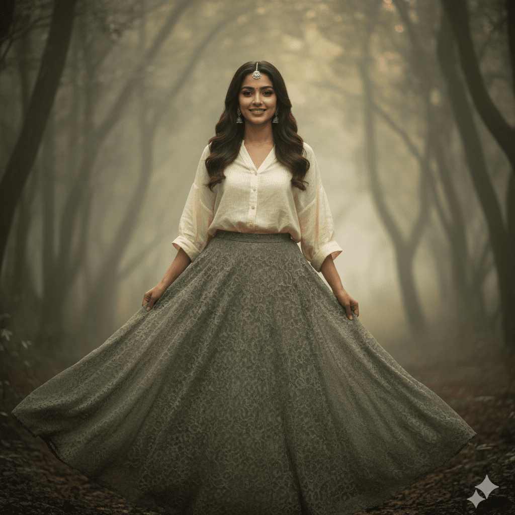 Transform this image into a cinematic scene depicting the person in an elegant flowy lace maxi skirt in Pea Green hue, layered with sustainable cotton blouse, natural outdoor setting with misty forest, soft volumetric lighting, earthy tones, hyper-realistic editorial style, 4K. Ensure the person's exact facial features are accurately integrated into the scene.