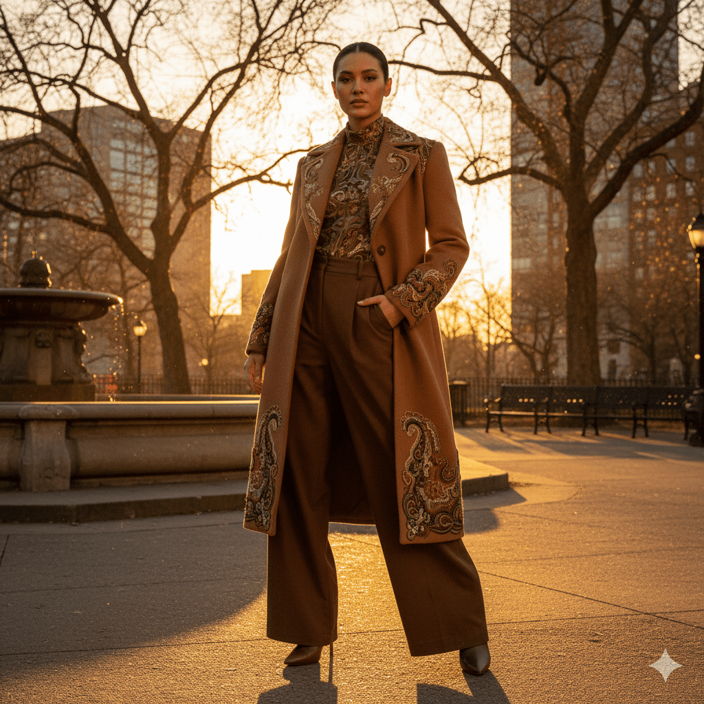 Transform this image into a cinematic scene depicting the person in a fashion editorial, wearing a Mocha Mousse tailored coat with embroidered details, paired with wide-leg pants, golden hour sunset in urban park, warm cinematic lighting, photorealistic textures, 8K. Ensure the person's exact facial features are accurately integrated into the scene.