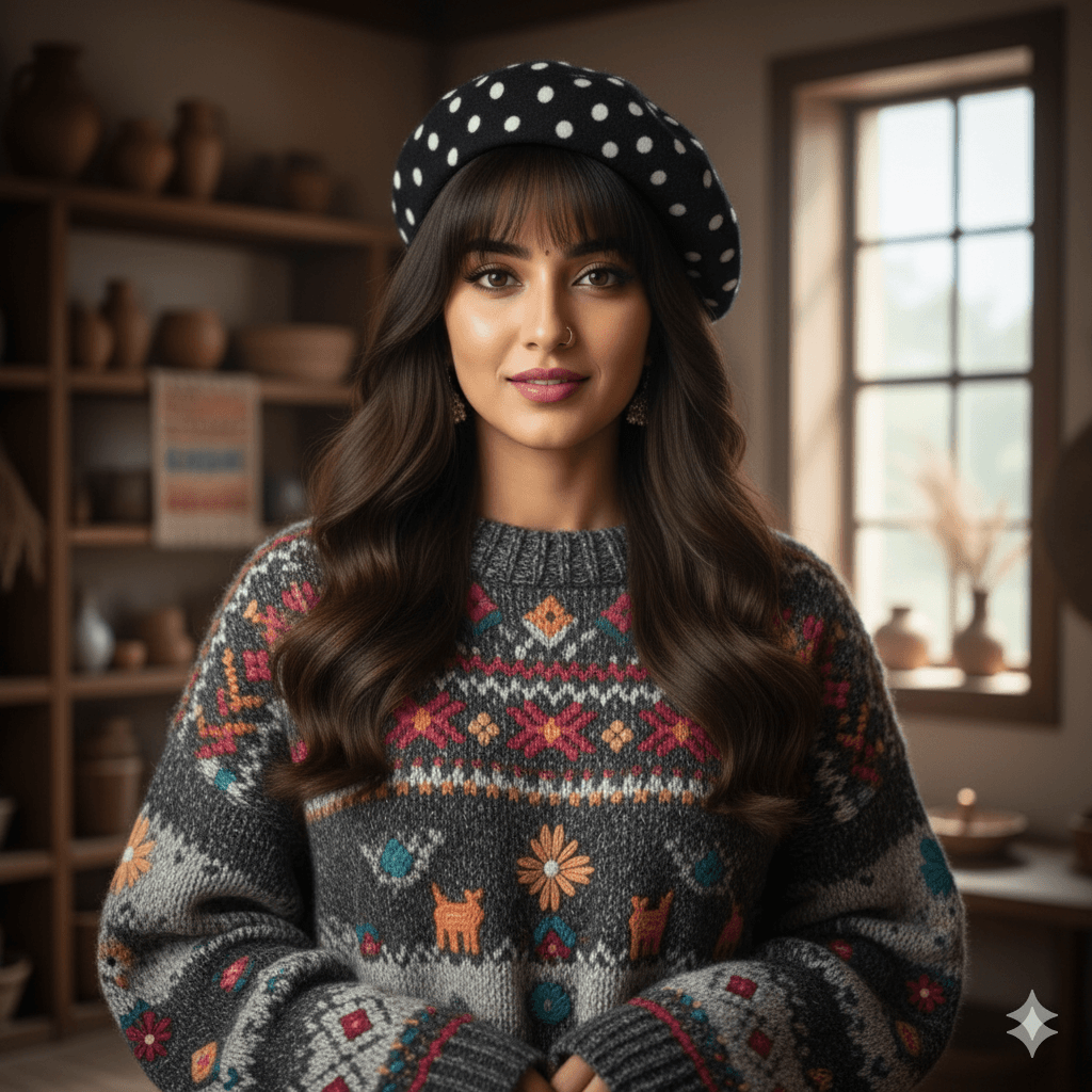 Transform this image into a cinematic scene depicting the person with a retro beret in polka dot fabric with curtain fringe hair, paired with an oversized knit sweater, soft natural grays, folk-inspired aesthetic, embroidered details, 8K. Ensure the person's exact facial features are accurately integrated into the scene.