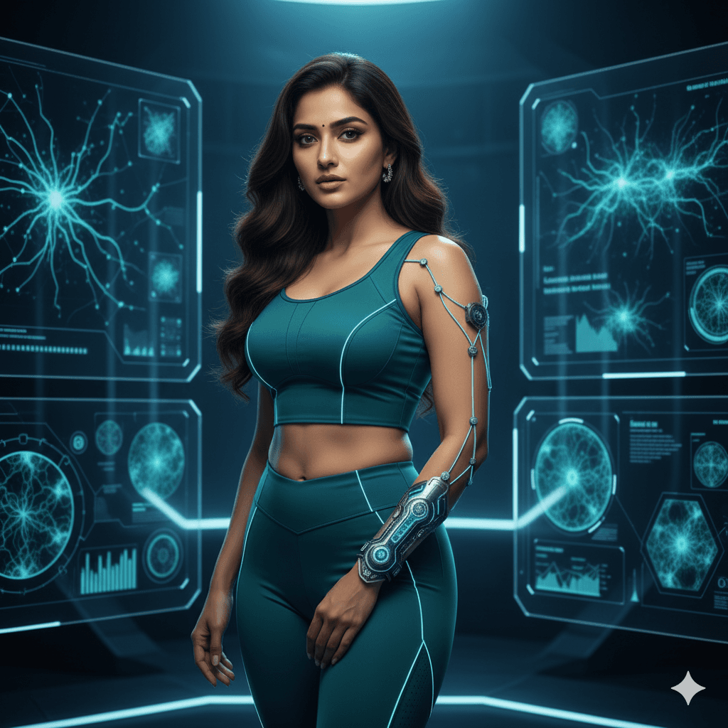 Transform this image into a cinematic scene depicting the person in a Transformative Teal neural wristband and athleisure set, high-tech studio with glowing interfaces, confident gaze, sleek couture aesthetic, hyper-detailed, 4K. Ensure the person's exact facial features are accurately integrated into the scene.
